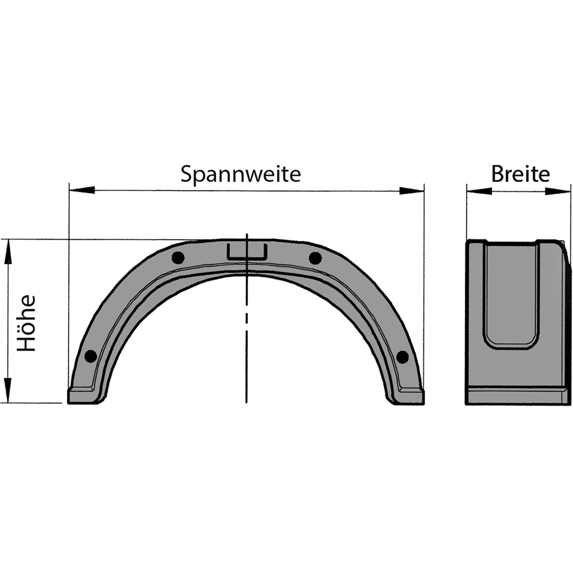 Einachs-Kotflügel AL-KO Ausführung rund, tiefgezogen Material Kunststoff Länge 900 mm Breite 220 mm Spannweite 680 mm Höhe 290 mm Reifenradius max. 280 mm 1 Seite mit Wulst 1 Seite für Bordwandbefestigung